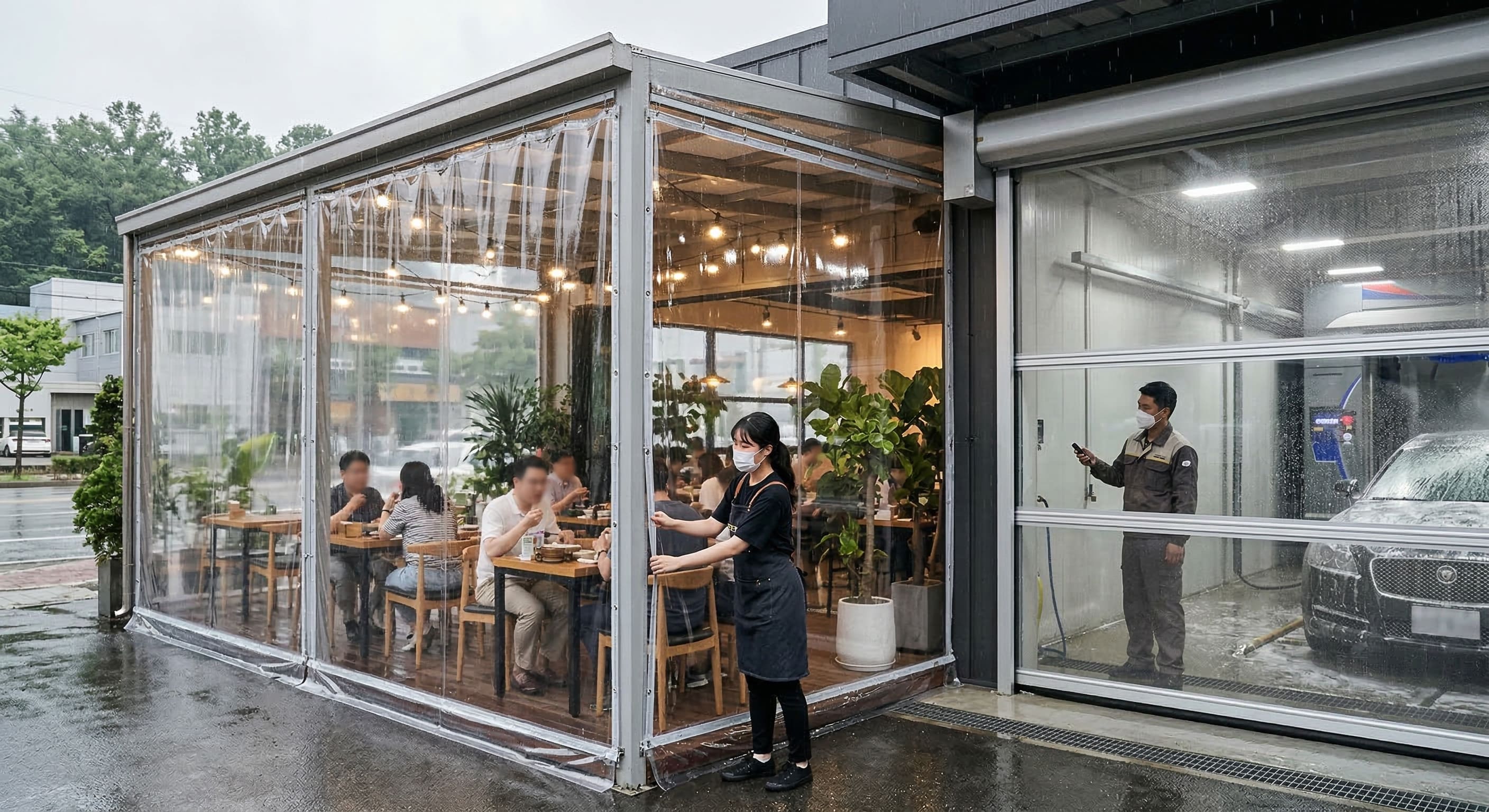 許多商業空間與工業廠房在規劃時,往往會刻意保留半戶外的區域。對於景觀餐廳或咖啡廳而言,露天座位能讓顧客享受微風與美景;對於汽車美容業或物流廠房來說,寬敞的無門設計能大幅提升車輛進出與上下貨的效率。